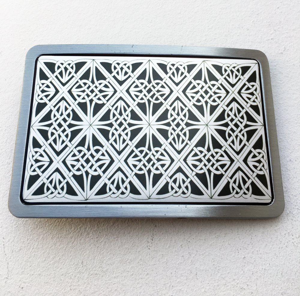 Boucle de ceinture de forme rectangle représentant des symboles celtes