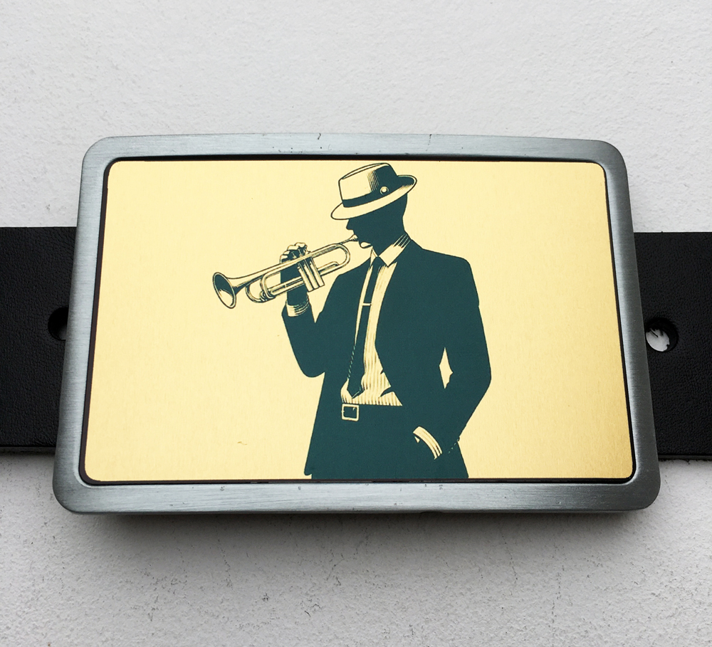 Boucle de ceinture de forme rectangle représentant un musicien jouant de la trompette
